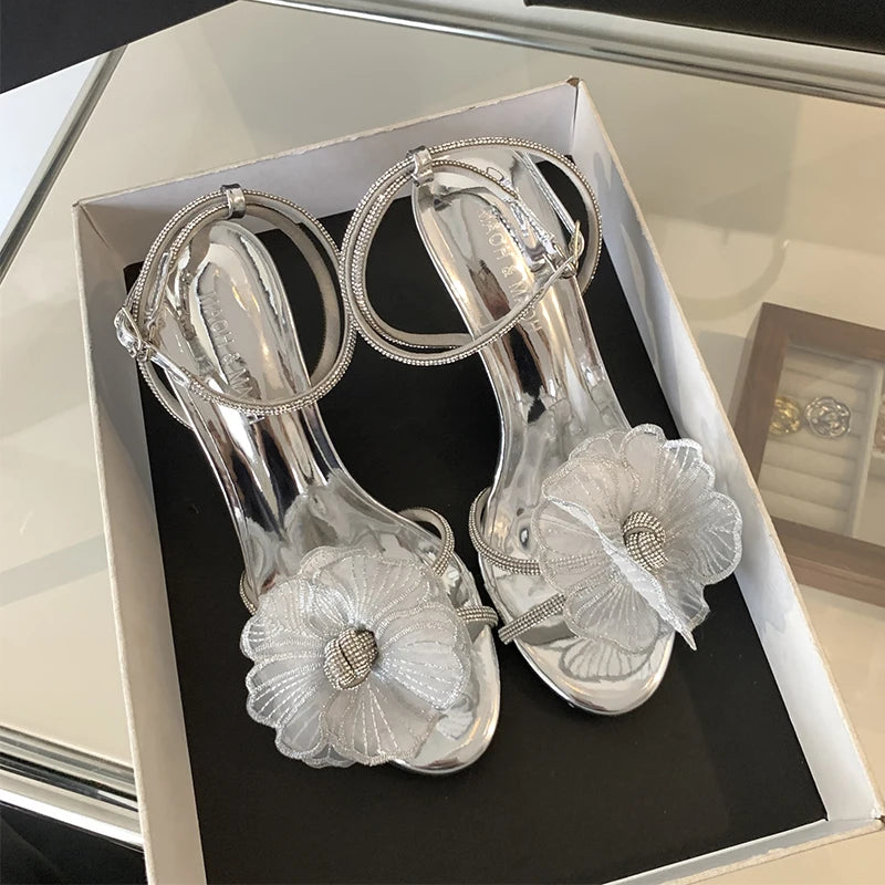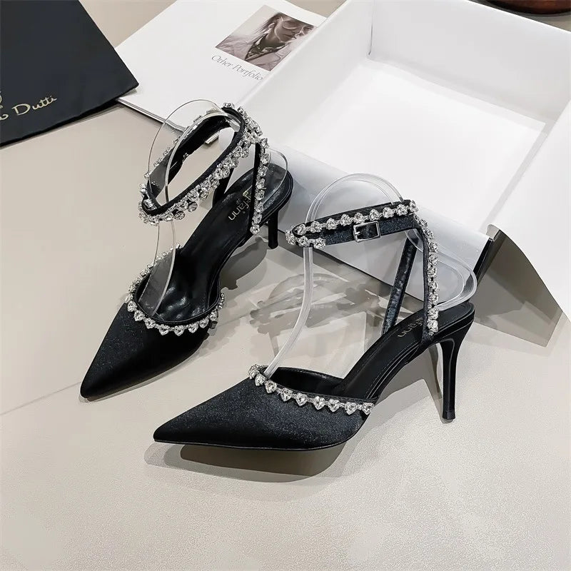 2025 New Banquet Baotou Heart-Shaped Water Diamond Hollow One-Line Buckle Silk Sandals Women'S High Heels