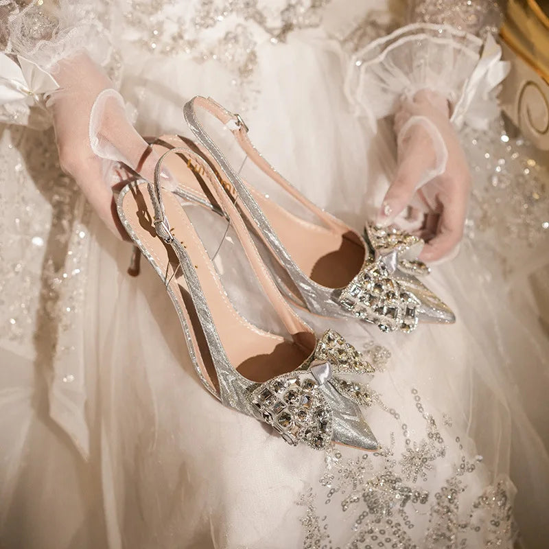 2025 New High-Heeled Wedding Shoes Bride Shoes Thin Heel Pointed Toe Sandals Nightclub Rhine-Diamond Shoes Bow