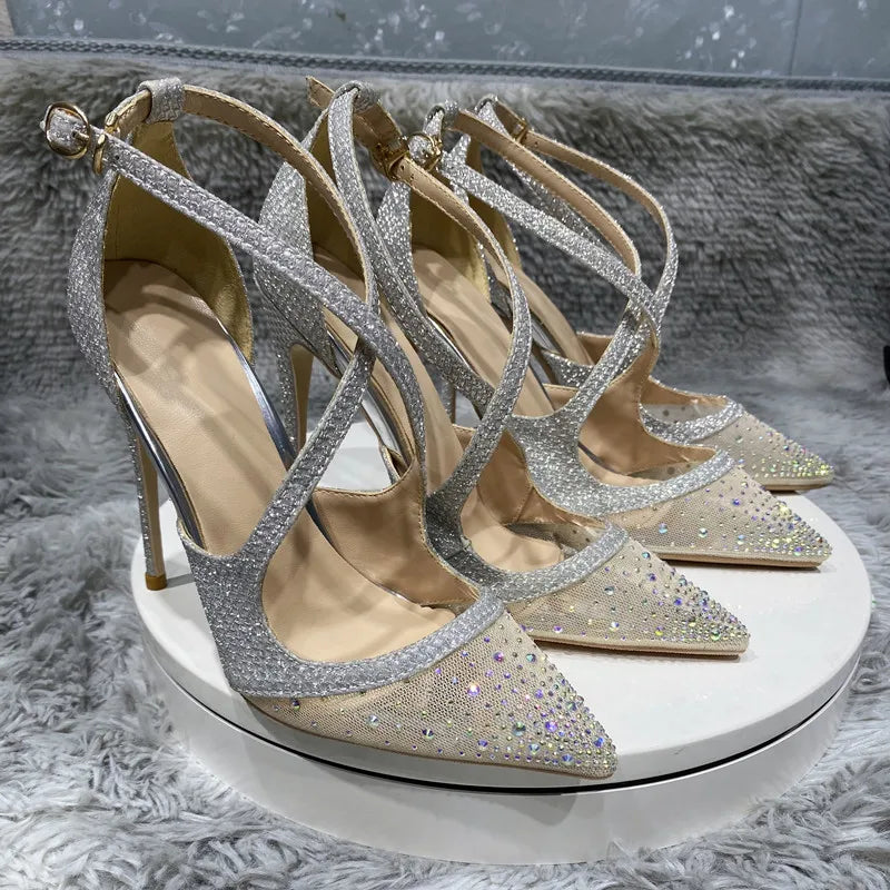2025 New Pair Of Glitter Heels Female Fairy Style Stiletto Heels Rhinobarrhine-Pointed Wedding Shoes Super High