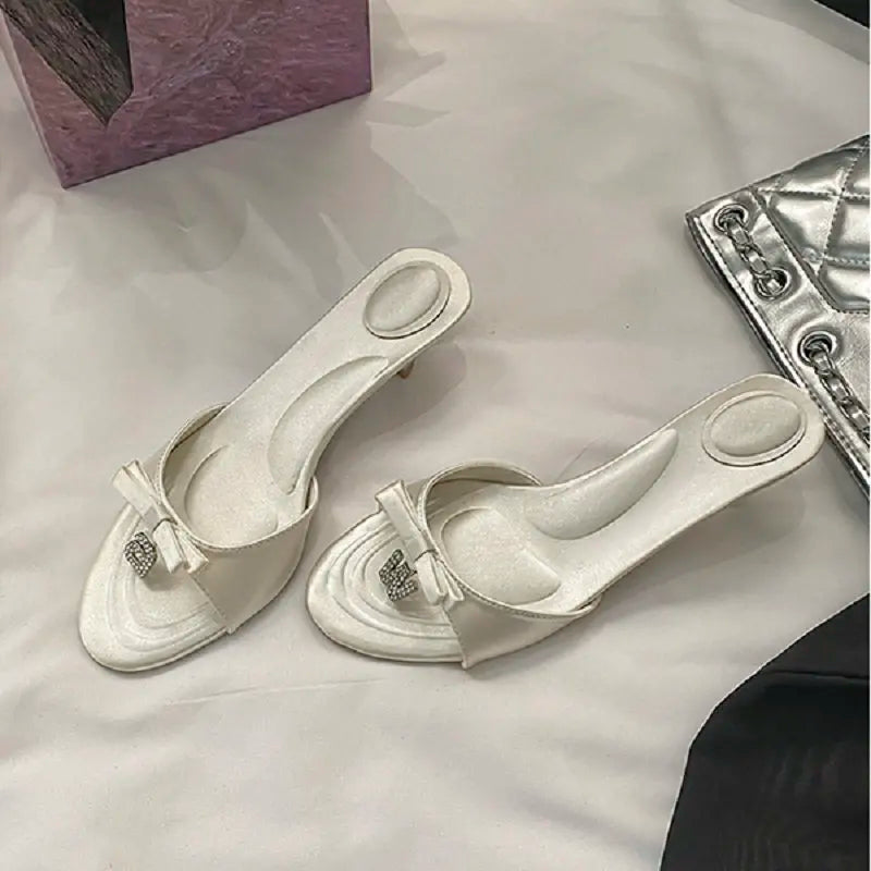 2025 New Lettered C-Style Water Diamond Bow Sandals, Women'S Satin Kitten And Flip-Flops, One-Line High Heels