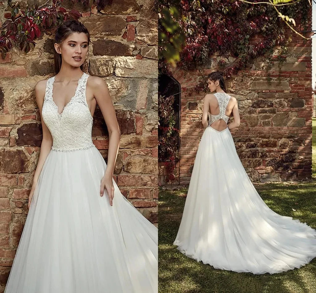 Fashion New Sexy Backless A Line Wedding Dress Halter Neck Sleeveless Applique Tiered Tulle Sweep Train Princess Bridal Gowns