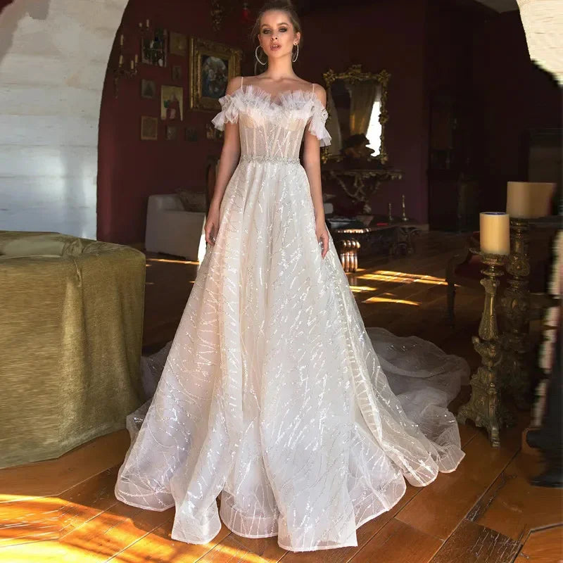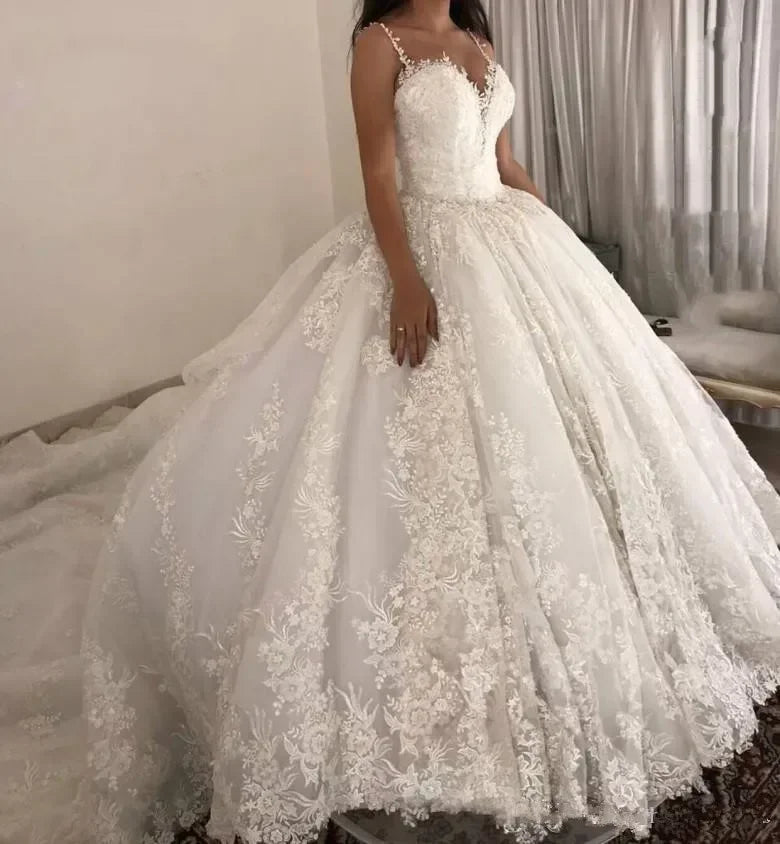 Luxury Elegant Princess Wedding Dress Romantic Wedding Sparkling lace applique Italian shoulder halter Beach custom bridal dress