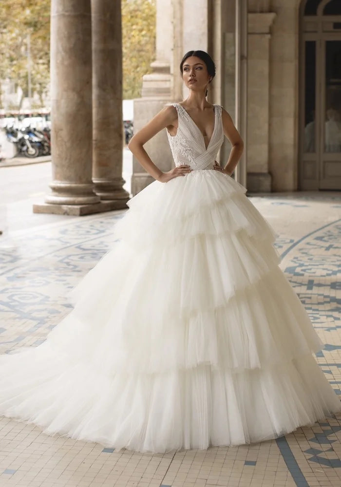 Customized Luxurious A-Line Ivory Multi-Layer Chiffon Applique Princess Wedding Dress Sexy Deep V-Neck Backless Ball Bridal Gown