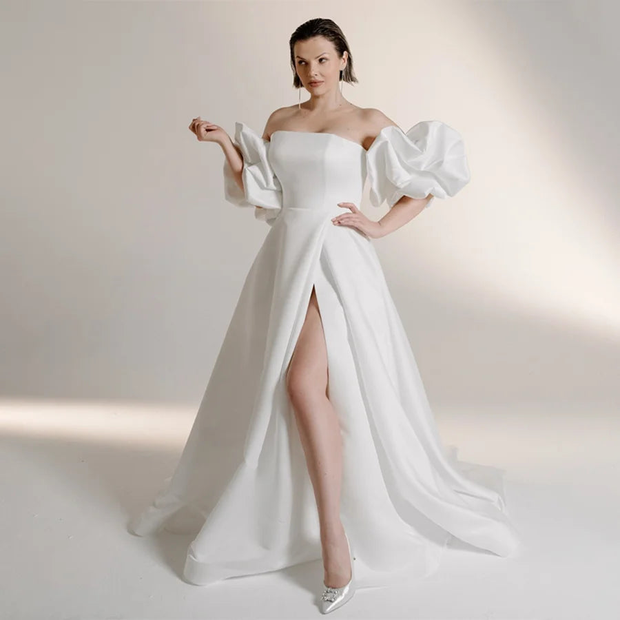Customized Puff Short Sleeve A-line Front Split Wedding Dress Backless Zipper Custom Size Bridal Gown