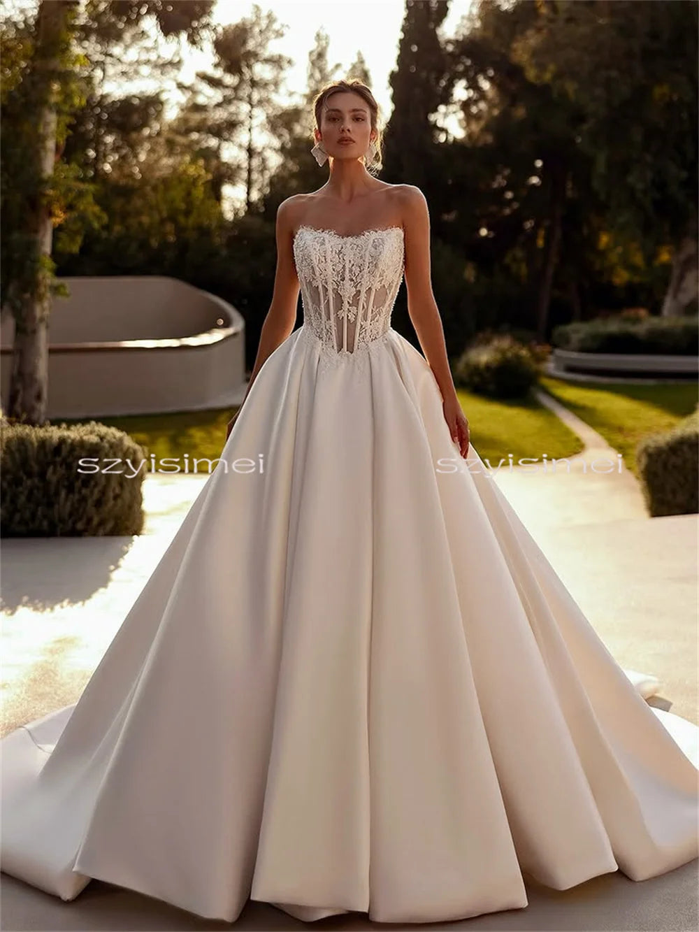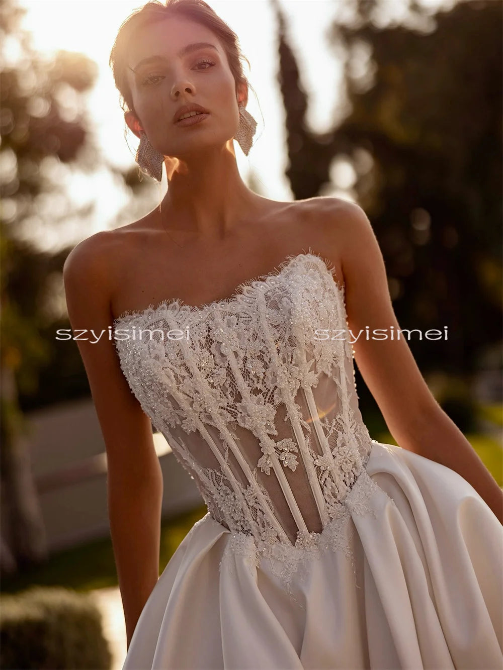 Charming Strapless Lace Applique For Top Bridal Dresses A Line Custom Made Wedding Dress Back Corset Rode De Morrie