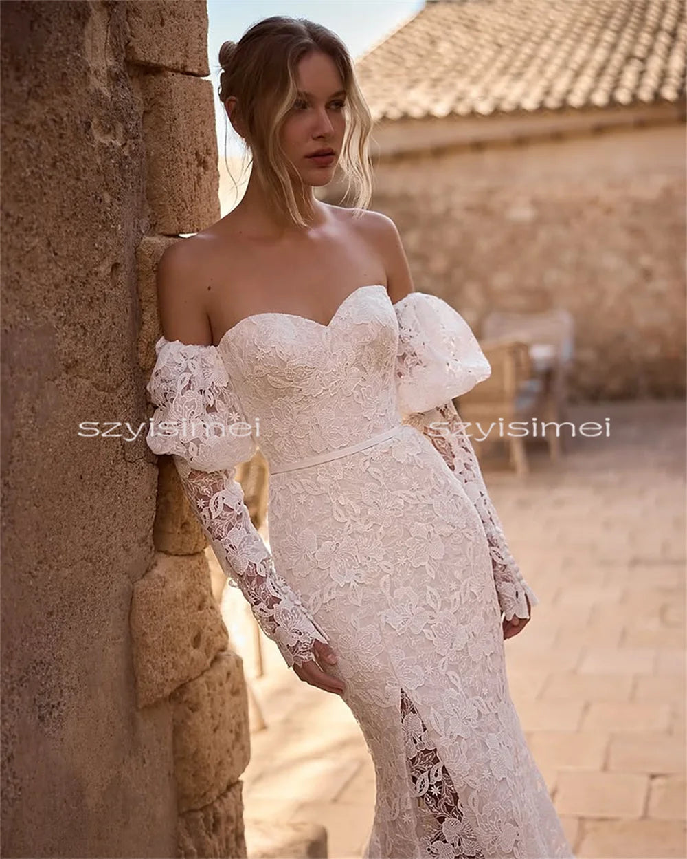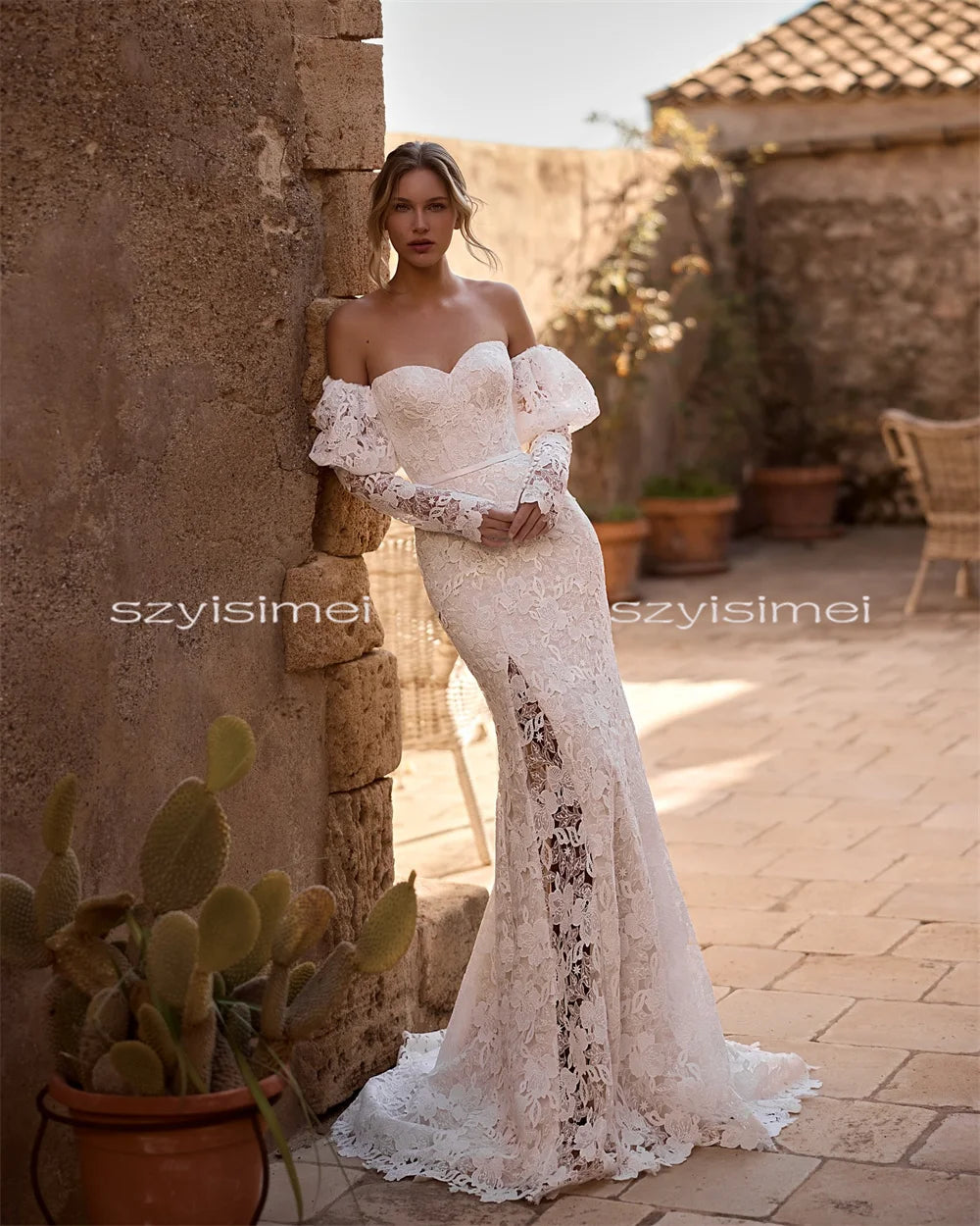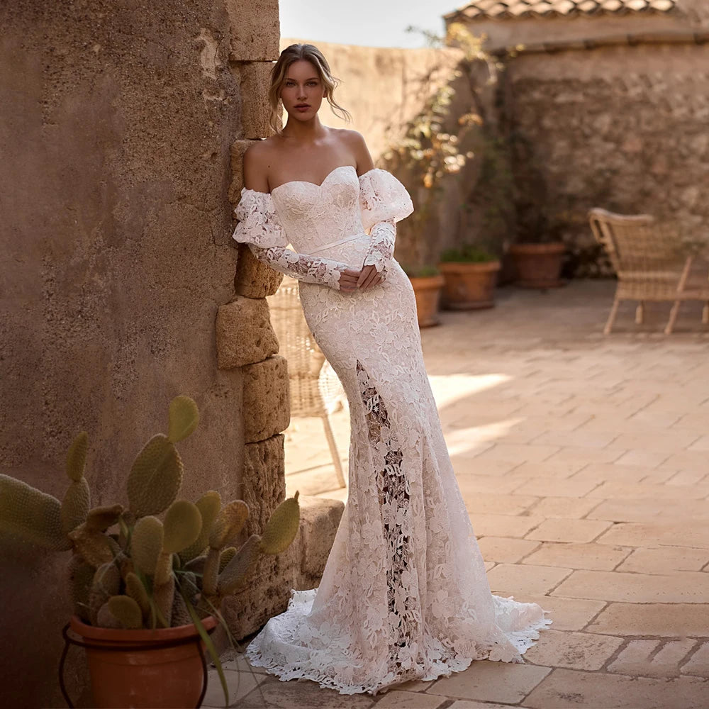 Classic Sweetheart Wedding Dresses for Women Bride Lace Mermaid Court Train 3/4 Puff Sleeves Bridal Gown Vestido De Casamento