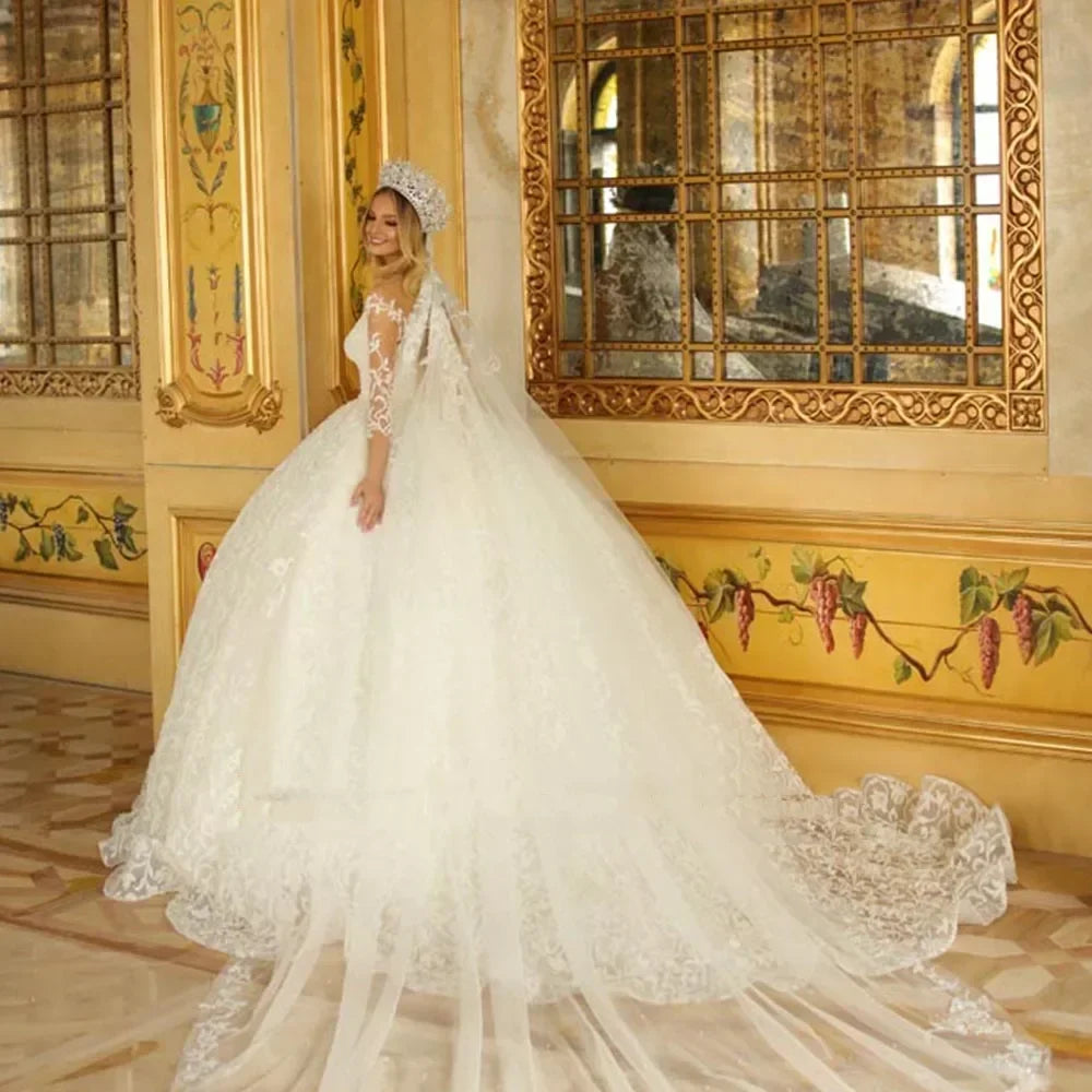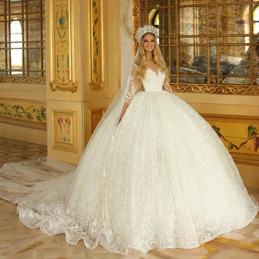 Elegant White A-Line Lace Decal Women's Fluffy Wedding Dress Sexy V-Neck Princess Dance Bridal Gown Vestido De Novia Customized