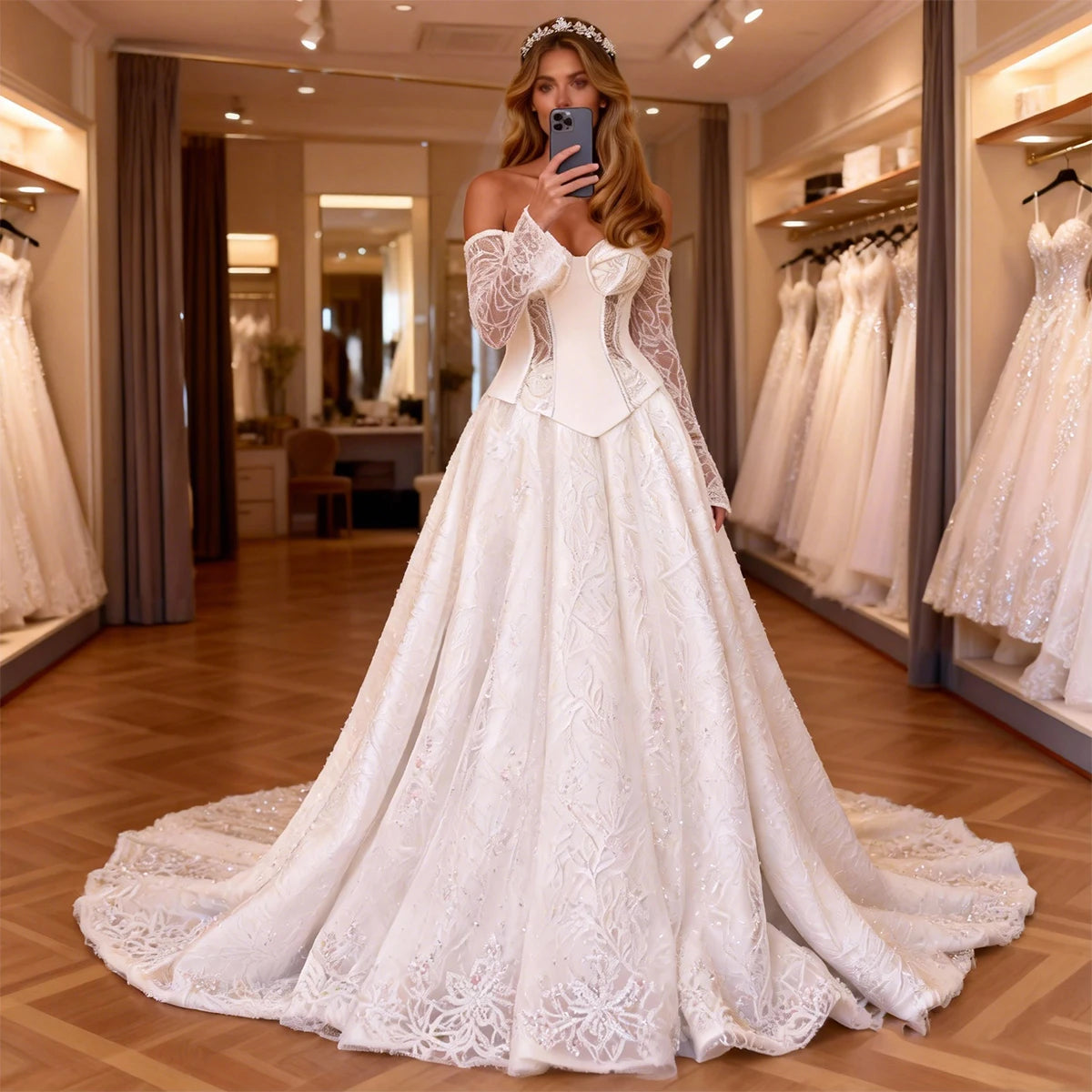 Every gown undergoes a meticulous creation process. Due to variations in lighting, display settings, and photography conditions, slight color differences may occur between product images and the actual dress. For the most accurate color reference, we recommend viewing on Apple devices.