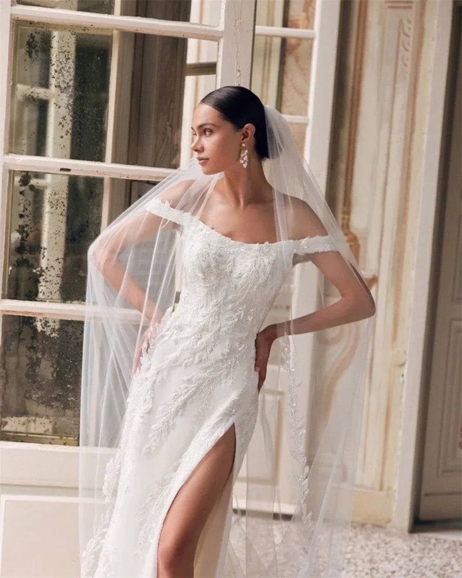 Off-Shoulder Lace Appliques Cap Sleeve Front Split Wedding Gown Back Zipper Custom Evening Gown