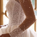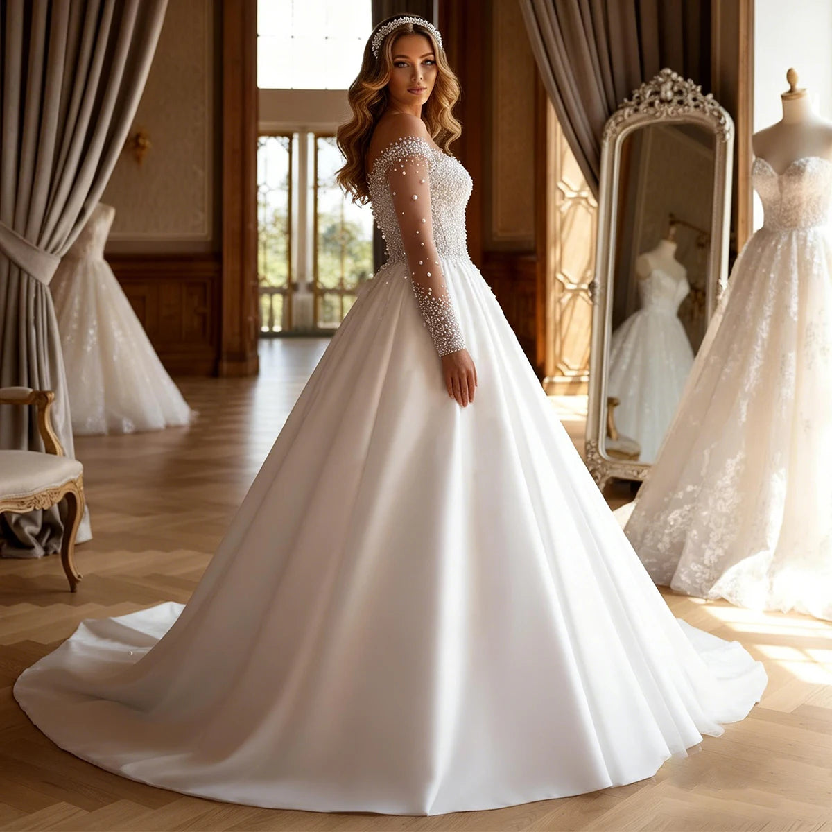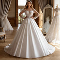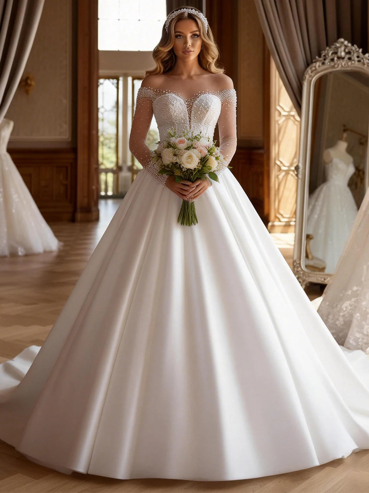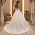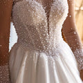 Romantic Satin Beaded Wedding Dress With Train Long Sleeve Ball Gown For Bride A Line Bridal Gown For Women