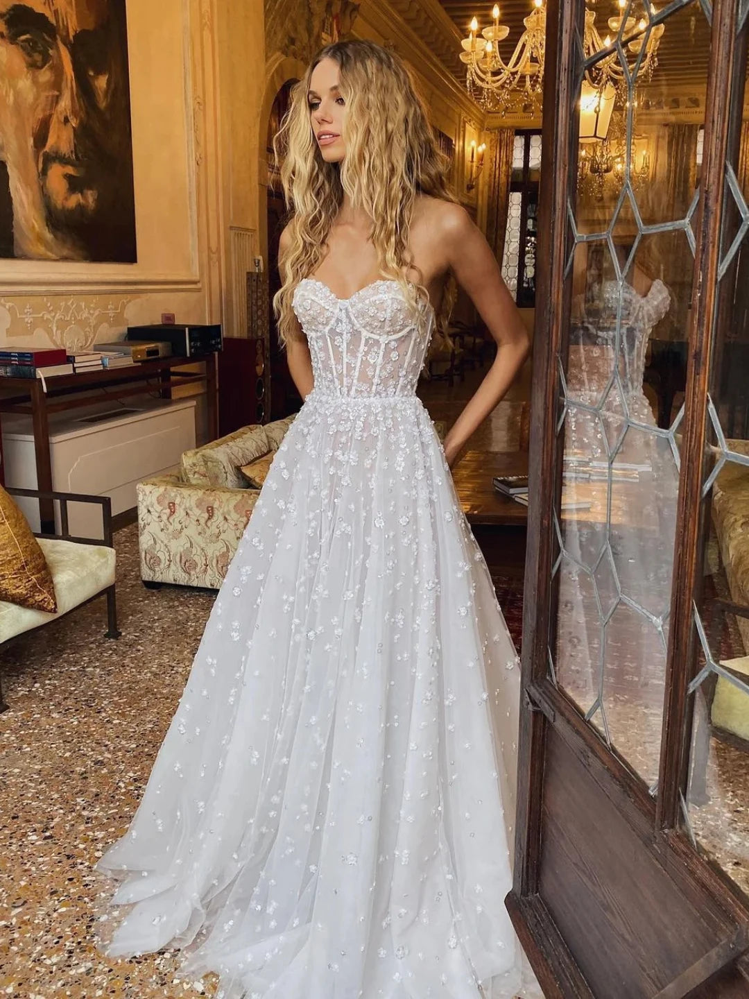 White A-line Princess tulle applique Sweetheart backless removable puffy sleeve Bohemian bride romantic wedding dress custom